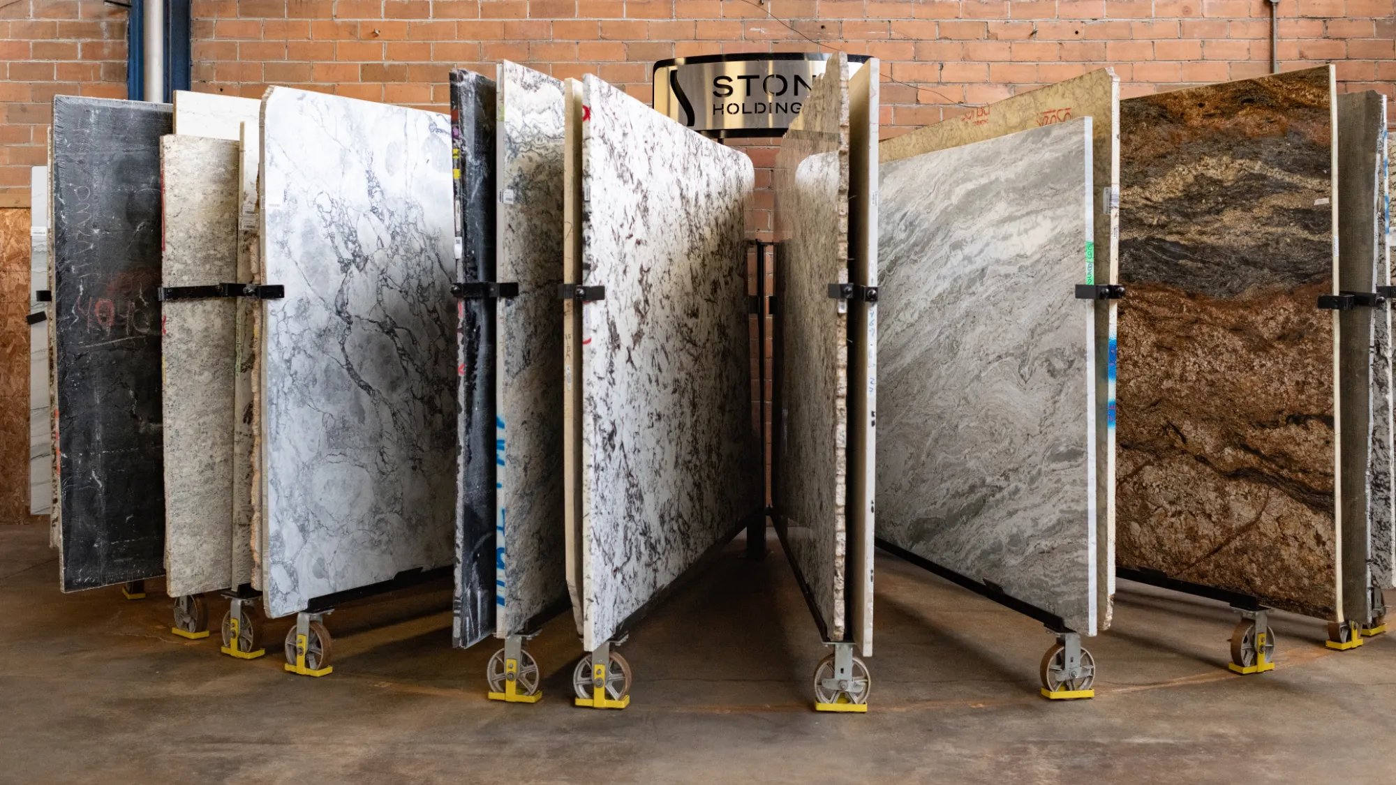 Use the interactive tool below to preview different stone vanity tops, tile, and surface options in a bathroom setting. When you're ready, visit one of our showrooms to see the full slab selection in person.